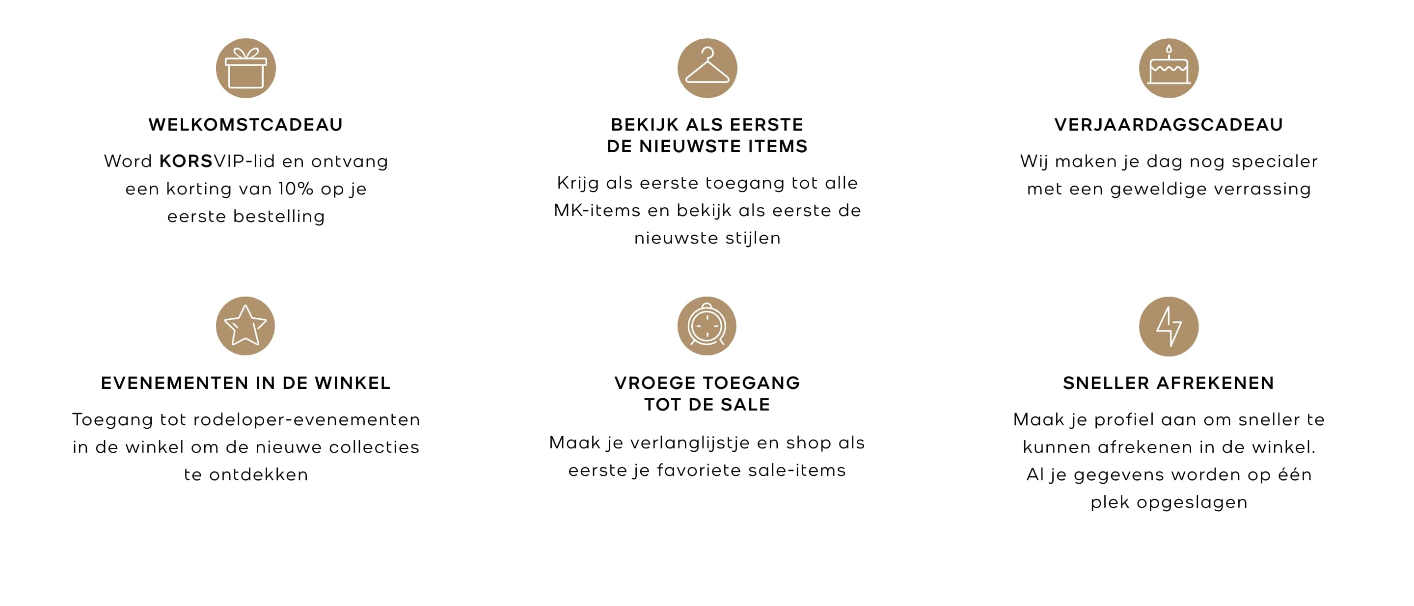 Als je graag bij ons shopt, dan hebben we goed nieuws voor je. We hebben een exclusief loyaliteitsprogramma gelanceerd, zodat je geweldige voordelen kunt verdienen als je online shopt bij Michael Kors. Word lid van KORSVIP en profiteer van een hele rits klantenvoordelen, zoals 10% korting op je eerste bestelling, een verjaardagscadeautje en meer. Je kunt gratis lid worden van ons loyaliteitsprogramma voor klanten en het lidmaatschap is ontzettend eenvoudig. Meld je gewoon aan voor onze e-mails of maak vandaag nog een KORSVIP-account aan om direct voordelen te gaan verdienen en te profiteren van onmisbare modevoordelen voor leden.