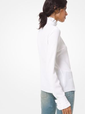 Questa blusa in seta marocain è l'emblema della femminilità. Con una finitura con volant e colletto con nastro rimovibile, sfoggia una silhouette morbida e un'elegante chiusura con bottoni. Indossala con un paio di pantaloni per le riunioni in ufficio, o con un paio di jeans nel weekend. Made in Italy.