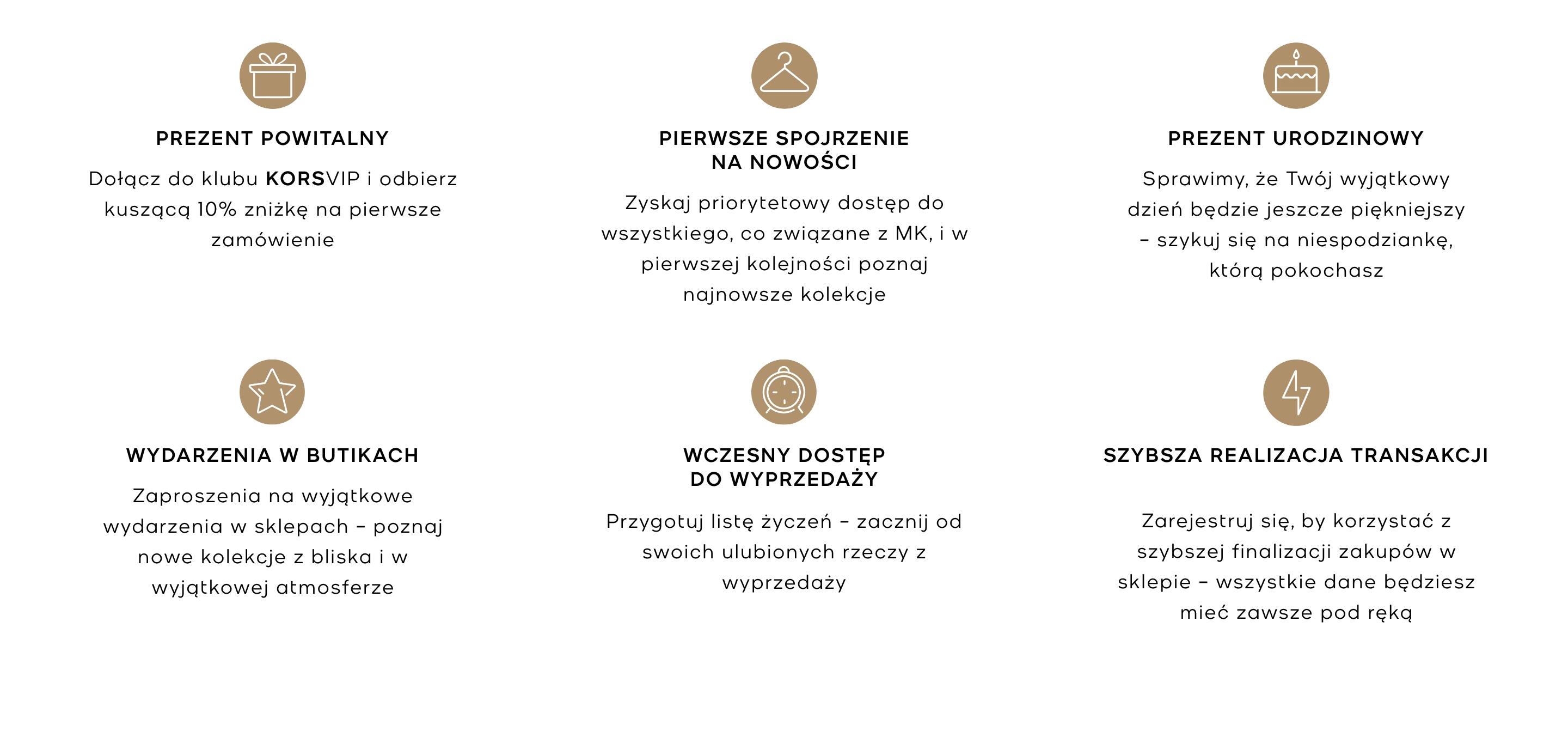 Jeśli uwielbiasz robić u nas zakupy, mamy dla Ciebie ekscytującą wiadomość. Właśnie uruchomiliśmy ekskluzywny program lojalnościowy, który zapewnia atrakcyjne przywileje podczas zakupów online w Michael Kors. Dołącz do KORSVIP, aby otrzymać szereg nagród dla klientów, w tym 10% zniżki na pierwsze zamówienie, prezent urodzinowy i nie tylko. Nasz program lojalnościowy jest całkowicie bezpłatny i niezwykle prosty. Wystarczy zapisać się do newslettera w formie wiadomości e-mail lub utworzyć konto KORSVIP już dziś, aby zacząć czerpać korzyści i cieszyć się niepowtarzalnymi modowymi nagrodami członkowskimi.