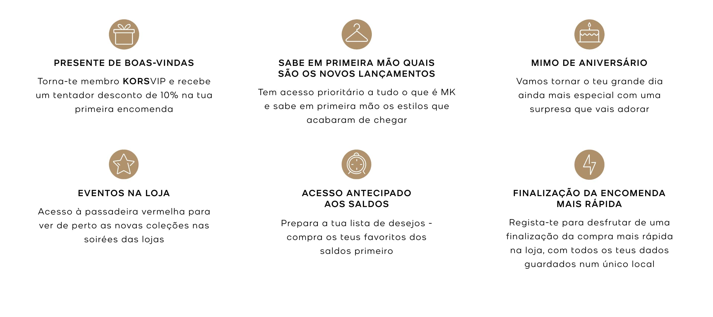 Se adoras fazer compras connosco, temos novidades empolgantes para ti. Acabámos de lançar um programa de fidelização exclusivo para que possas ganhar regalias tentadoras quando comprares online na Michael Kors. Adere ao KORSVIP para desfrutares de uma vasta gama de recompensas para clientes, incluindo 10% de desconto na tua primeira encomenda, um presente de aniversário e muito mais. O nosso programa de fidelização de clientes grátis não cobra taxa de adesão e é incrivelmente fácil de aderir. Basta subscreveres os nossos e-mails ou criar uma conta KORSVIP ainda hoje para começares a ganhar regalias e a desfrutar de recompensas de moda imperdíveis para aderentes.